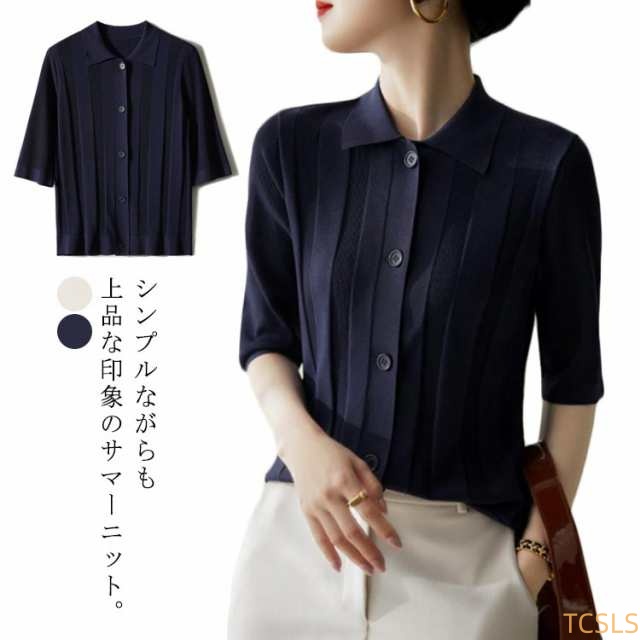 春 サマーニット 襟付き五分袖サマーニット レディース 春服 シンプル 涼しい 無地 きれいめ 大人 女子 半袖 ニット 5分袖 襟付き五分袖サマーニット 春夏 トップス 体型カバー 二の腕をカバー アイスシルク お洒落 大人っぽい オフィスカジュアル ブラウス きれいめ ネイビー