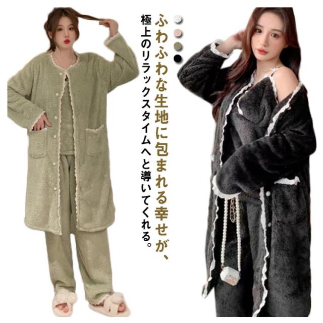 3点セット ルームウェア レディース もこもこ モコモコ 冬 可愛い カーディガン 前開き 前開きロングカーディガン ワンピース キャミソール Vネック 冬用 あったか 着る毛布 ロング かわいい 暖かい セットアップ パジャマ 冬 冬用