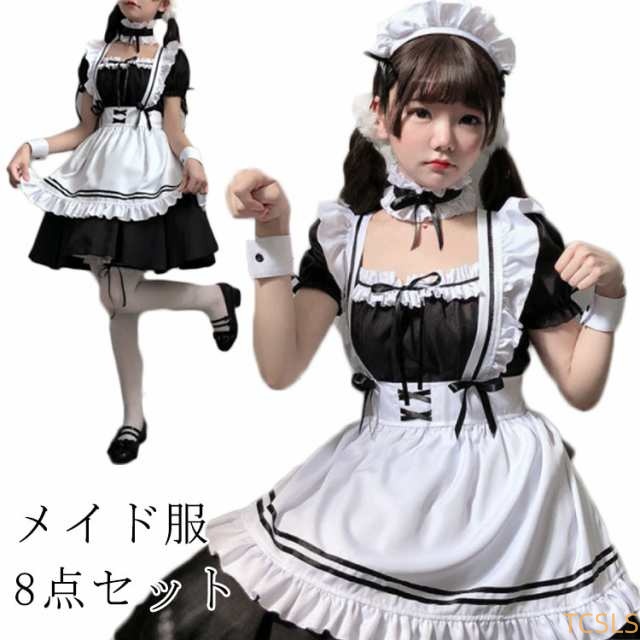 メイド服 8点セット コスプレ仮装 メイド服 コスプレ メイド コスプレ衣装 大人 セクシー ハロウィン セット フリル レディス コス 帽子 ヘアバンド 襟 エプロン 可愛い かわいい リボン 白 黒 ホワイト ブラック ハイウエスト