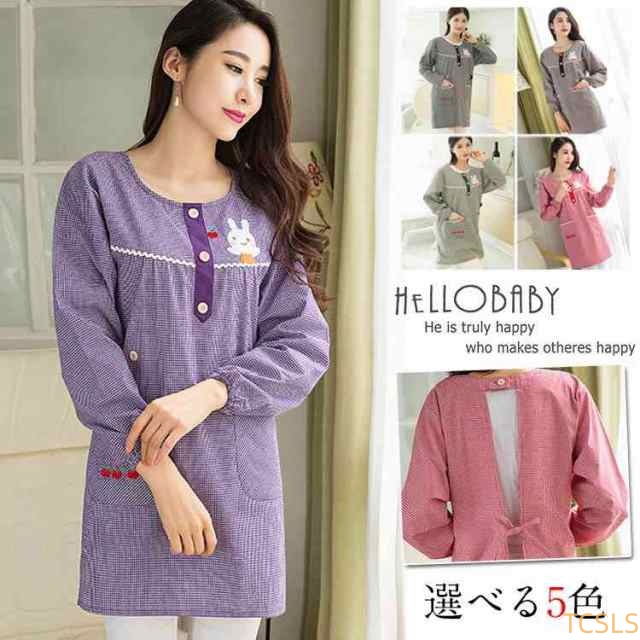 エプロン レディース 保育士 チュニック ナチュラル 長袖 キャラクター うさぎ 刺繍 おしゃれ 可愛い チェック柄 パープル