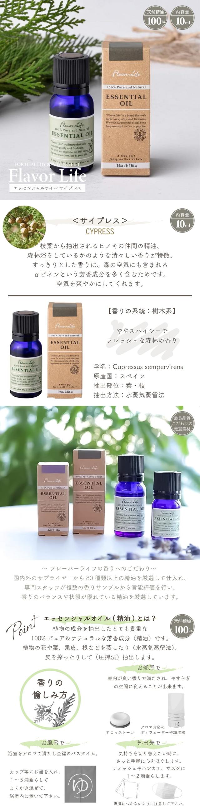 アロマ 精油 フレーバーライフ エッセンシャルオイル サイプレス 10ml 天然精油100% 原産スペイン 水蒸気蒸留法 樹木系 スパイシー フレッシュ 森林 アロマオイル フレグランス アロマテラピー ヒーリング 加湿器 ディフューザー アロマスプレー