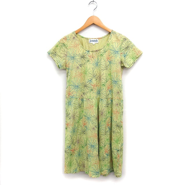【中古】ホコモモラデシビラ Jocomomola de Sybilla 柄 フレア ワンピース 半袖 ひざ丈 コットン 綿 40 ライトグリーン