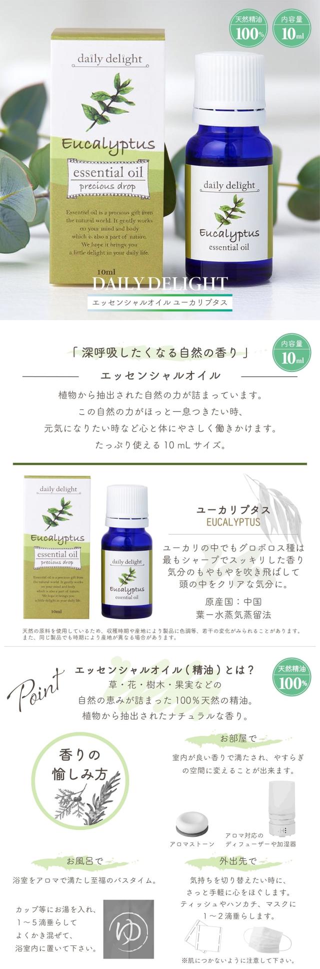 アロマ 精油 デイリーディライト エッセンシャルオイル 10mL ユーカリプタス 天然精油100% 原産中国 水蒸気蒸留法 シャープ スッキリ アロマオイル フレグランス アロマテラピー ヒーリング 加湿器 ディフューザー アロマスプレー