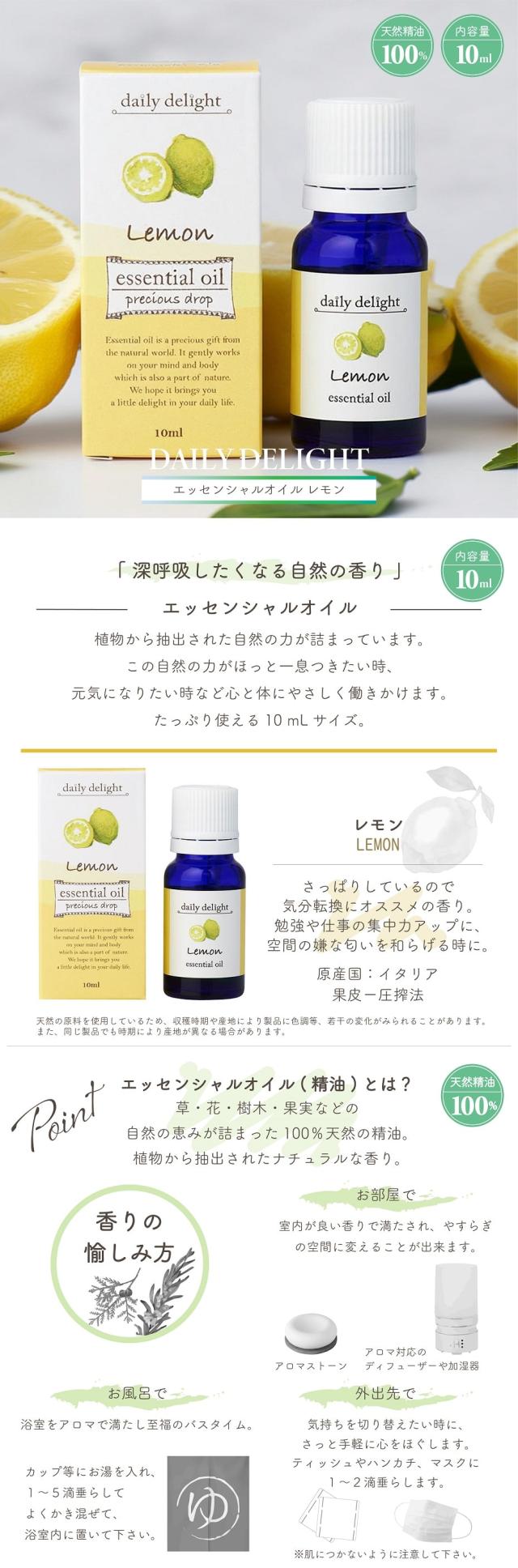 アロマ 精油 デイリーディライト エッセンシャルオイル 10mL レモン 天然精油100% 原産イタリア 圧搾法 さっぱり スッキリ アロマオイル フレグランス アロマテラピー ヒーリング 加湿器 ディフューザー アロマスプレー