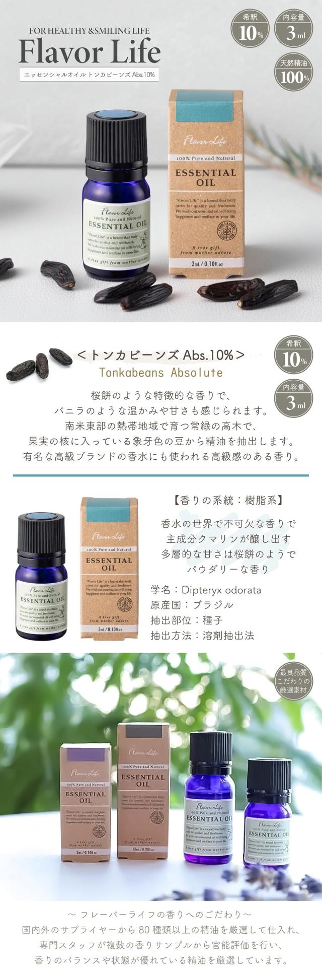 アロマ 精油 フレーバーライフ エッセンシャルオイル トンカビーンズ Abs10% 3ml 天然精油100% 高級感 原産ブラジル 溶剤抽出法 アブソリュート 樹脂系 桜餅調 バニラ調 アロマオイル フレグランス アロマテラピー ヒーリング 加湿器 ディフューザー アロマスプレー