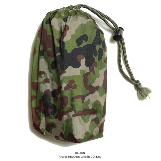 陸上自衛隊で正式採用されている現行の迷彩柄を忠実に再現した、かわいらしい子供用レインポンチョ。本体と専用ポーチの2点セット。