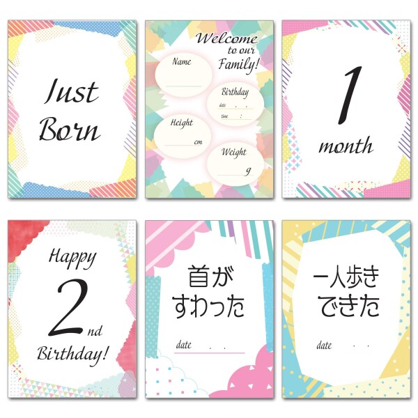 ?記念日カードは、「JUST BORN」「名前・誕生日・身長・体重」「HALF BIRTHDAY」「100DAYS」「1st Birthday」「2nd Birthday」「3rd Birthday」の7種類。 産まれたその日から、3歳までの記念日を逃しません。