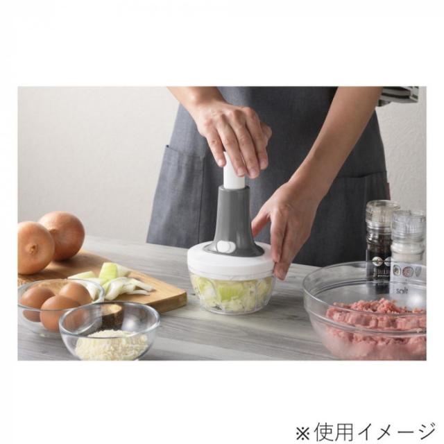 | 上から押すだけで簡単にみじん切りや野菜の水切りができます。シャキシャキのサラダや下ごしらえに便利です。フードプロセッサー容器は蓋付きなので、下ごしらえした食材の一時保存に便利です。 |