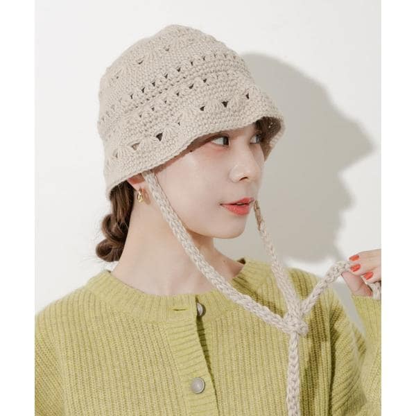 温かみのあるクロシェ編みで、一つ一つ丁寧に仕上げたような風合いのニットハット。