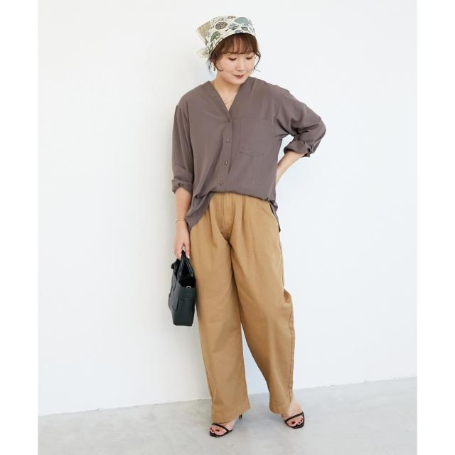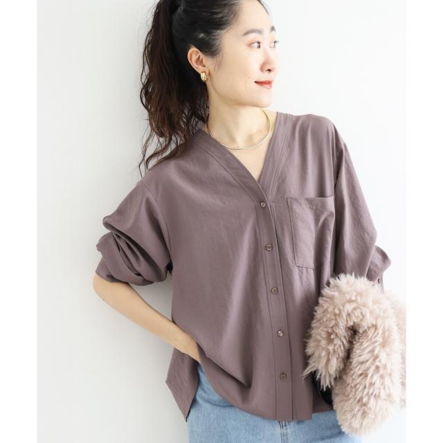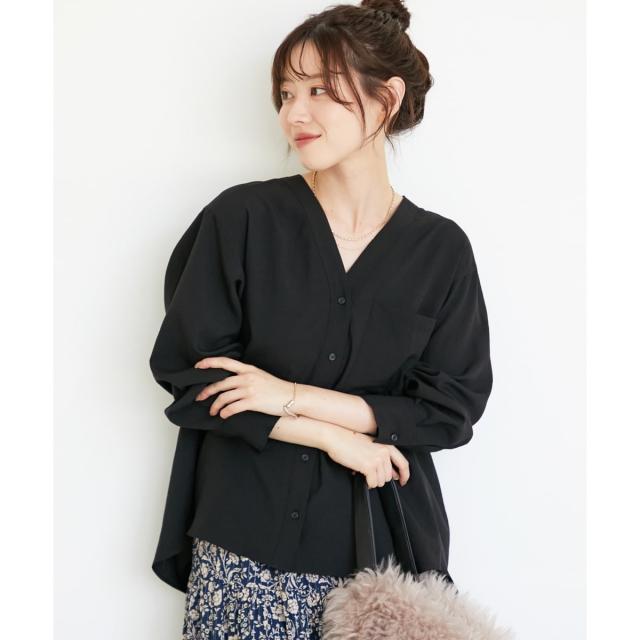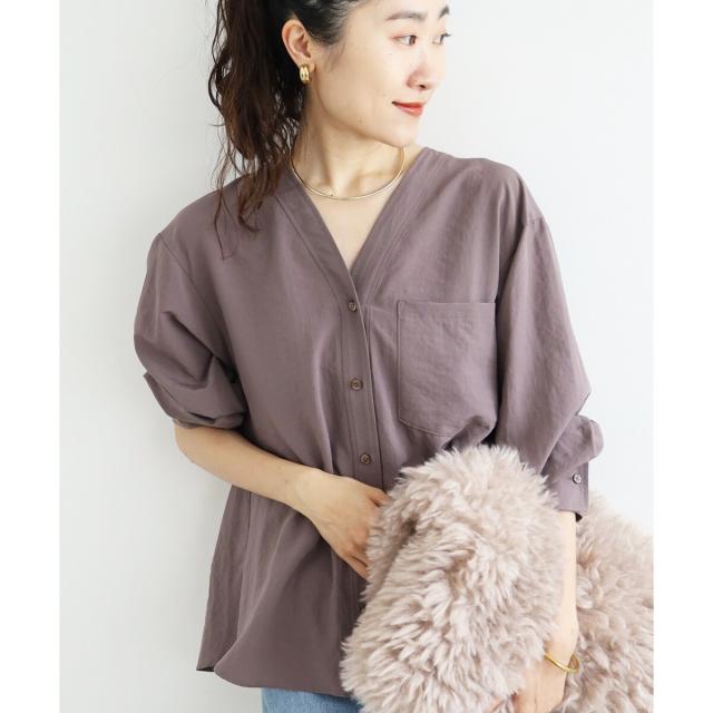 ゆったりしたシルエットで女性らしいVネックのデザインシャツブラウスです。