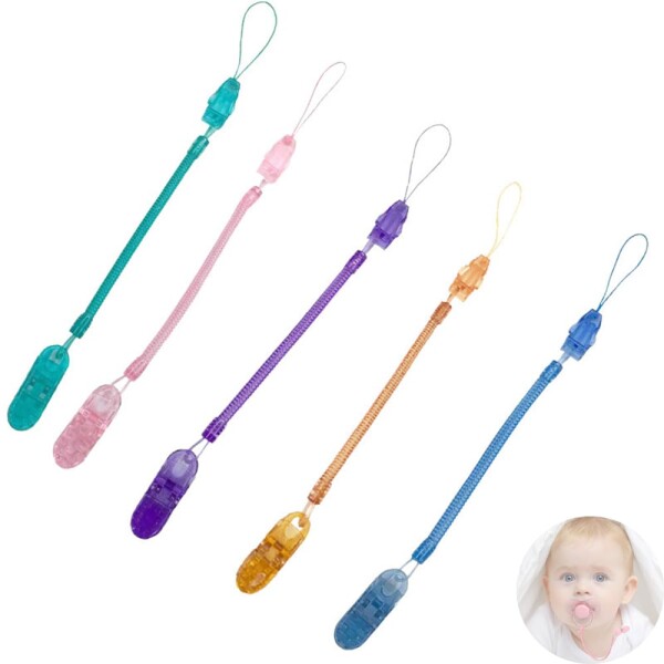 【製品仕様】おしゃぶりホルダーは、お得な5本セットで可愛いデザインのおしゃぶりホルダーです。ピンク、ブルー、グリーン、パープル、イエロー5カラー含みます。ご家庭用や外出用など、使い分けができますので、様々なシーンで活躍します。