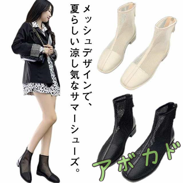 メッシュブーツ ショートブーツ レディース サマーブーツ 透け感 シースルー シアー シューズ メッシュ 靴 ローヒール 3cmヒール ラウンドトゥ 歩きやすい 疲れない 痛くない 軽い 軽量 春夏 バックジッパー フェミニン きれいめ カジュアル シンプル 美脚 20代 30代 40代