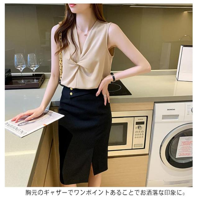 | vネックの上品なノースリーブブラウスになります。 薄めのサラッとしたとろみ生地感で軽やかな着心地が女性らしい印象に仕上がります。 胸元のギャザーでワンポイントあることでお洒落な印象に。 夏には一枚でサラッと、春や梅雨、秋はジャケットやカーディガン、ライダースやトレンチコートなどと合わせて頂くことで、長い季節活躍の一着となります。 勤や仕事などオフィススタイルはもちろん、食事会やカジュアルなパーティー、デートやお出かけなど様々なシーンで活躍のアイテムとなります。 | |