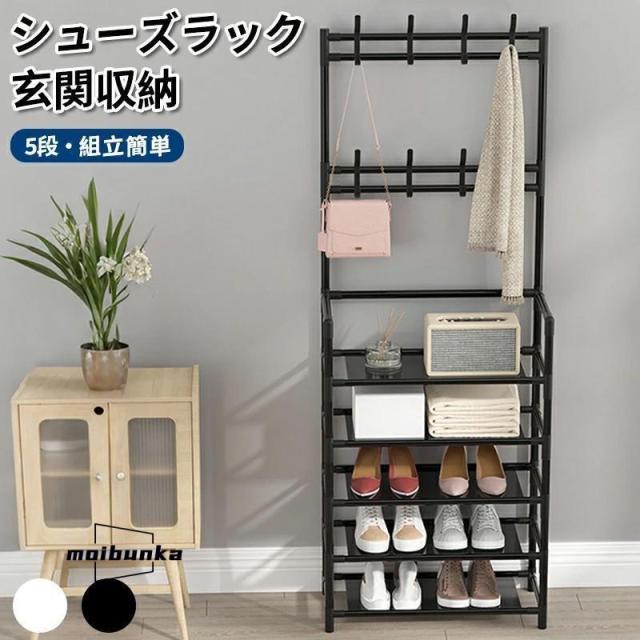 大容量 5段 ハンガーラック シューズ ラック 靴 収納 スリム 省スペース 頑丈 おしゃれ 便利 収納ラック 玄関収納 洋服掛け 帽子かけ 棚付き コート掛け
