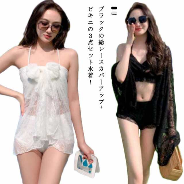 | ブラックの総レースカバーアップ+ビキニの3点セット水着! リッチなブラックレースは女っぽさUP! 長袖、ショートパンツタイプでカバーと肌見せのバランス。 ビキニはアンダー調節可能、ネックタイプで谷間メイクも叶う。 ショーツは動きやすいショートパンツタイプ! サイズも豊富な嬉しいS?XL展開!! | |