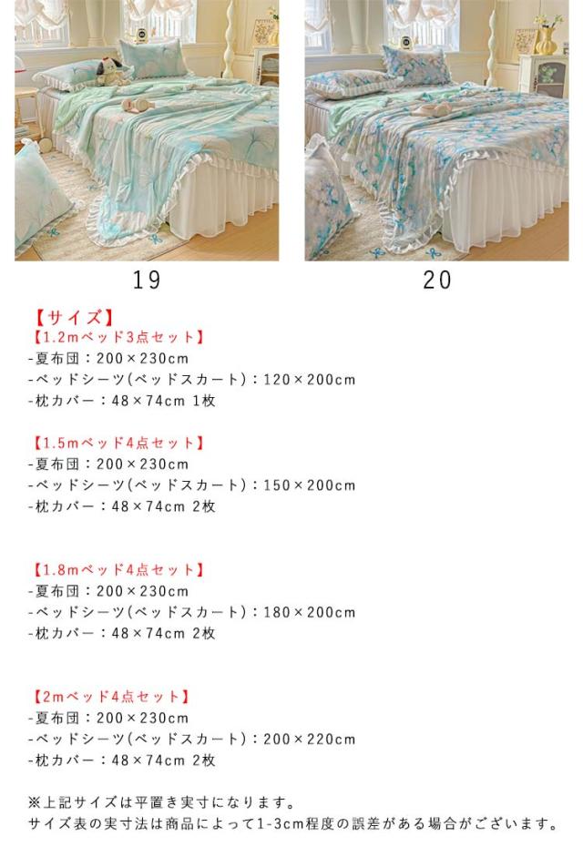 | サイズについての説明 | 【サイズ】 【1.2mベッド3点セット】 -夏布団:200×230cm -ベッドシーツ(ベッドスカート):120×200cm -枕カバー:48×74cm 1枚 【1.5mベッド4点セット】 -夏布団:200×230cm -ベッドシーツ(ベッドスカート):150×200cm -枕カバー:48×74cm 2枚 【1.8mベッド4点セット】 -夏布団:200×230cm -ベッドシーツ(ベッドスカート):180×200cm -枕カバー:48×74cm 2枚 【2mベッド4点セット】 -夏布団:200×230cm -ベッドシーツ(ベッドスカート):200×220cm -枕カバー:48×74cm 2枚 ※上記サイズは平置き実寸になります。 サイズ表の実寸法は商品によって1-3cm程度の誤差がある場合がございます。 |