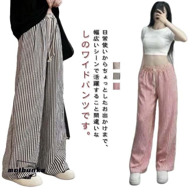 ストライプ パンツ レディース 春 夏 秋 ワイドパンツ ボ ひんやり 涼しい パンツ ワイド スラックス ワイドパンツ ストライプ柄 美シルエ