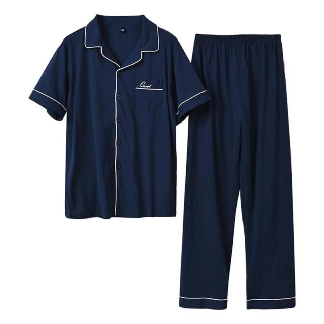 [Hanmeimei] パジャマ 綿 100 レディース メンズ 夫婦 ルームウェア 夏 開襟 部屋着 半袖 九分丈パンツ 上下セット ポケット付き 吸汗 通気性 男女 (ネイビー/メンズ(綿 半袖), XL)