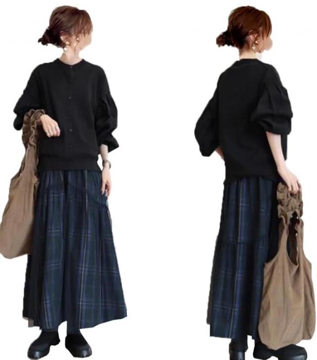 [DYIOPMFGZ] セットアップ レディース カーディガン+チェック柄スカート ロングスカート セーター プルオーバー プリーツスカート 上下セット 2点セット 大人 おしゃれ Aライン 普段着 デート 春秋 ファッション ゆったり 部屋着 (ブラック