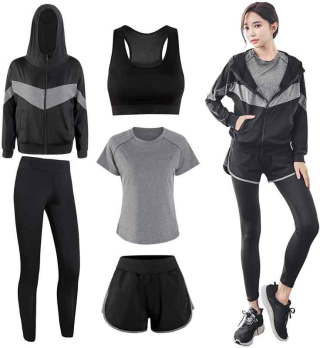 スポーツブラジャー&Tシャツ&スポーツパーカー&ハーフパンツ&タイツ 全て揃った上下5点セットのスポーツウエ ア自分の好みに合わせて様々な組み合わせることができる。