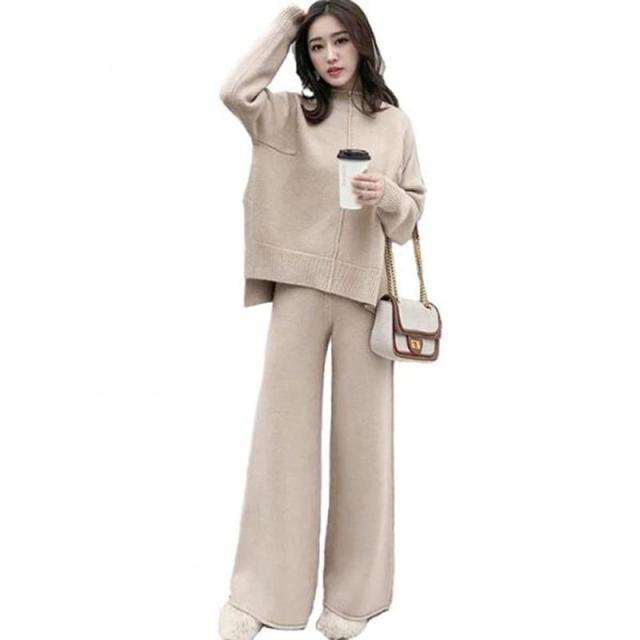 [CARLIE KLOSS] Vネック ニット ワイドパンツ レディース セットアップ パンツスーツ 同窓会 服装 ツーピース フォーマル 上下 二点セット 秋 冬 (ホワイト, XL SlimLong)