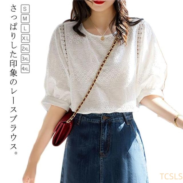 ブラウス 送料無料 大きいサイズ 夏 レディース 半袖 シャツブラウス ゆったり 五分袖 クルーネック パフスリーブ 白 プルオーバー 刺繍 刺しゅう コットン シンプル おしゃれ トップス