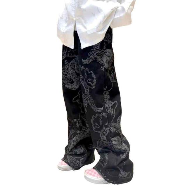 [TOWYYO] 原宿系 チャイナ服 メンズ デニムパンツ 龍 竜 総柄 ワイドパンツ ジーンズ ストレート ロング丈 高見 ストリート系 体型カバー 個性的 ロック ボトムス ラッパズボン 渋谷系 春 秋 通年 (XL)