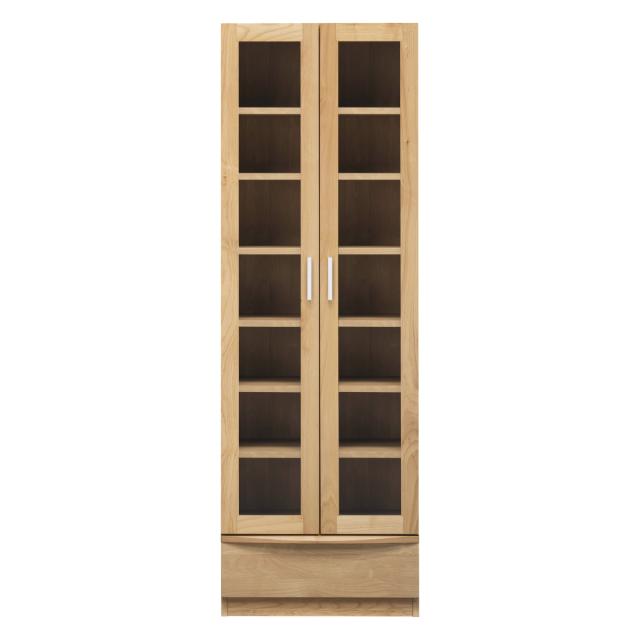 美しい木肌が特長のアルダー材を使用したガラス扉の本棚です。ガラス扉は、大切な書籍や趣味のコレクションなどをホコリから守ります。アルダー材は経年変化を楽しめ、長くお使いいただけます。