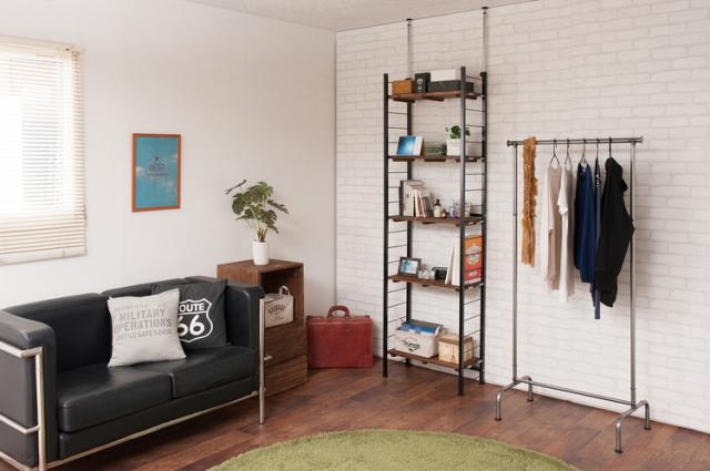 棚板を10cm間隔で好みの位置に自由にセットできる楽しい家具。ディスプレイ空間とハンガーラックで見せるワードローブなどオシャレな店舗風にお部屋をイメージ。
