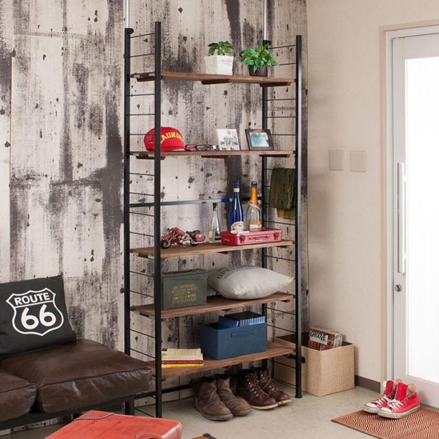 ヴィンテージな風合いの棚板を使用した『Radi』ラディシリーズ。突っ張り式で高い位置まで棚板をセットできるタワー型。