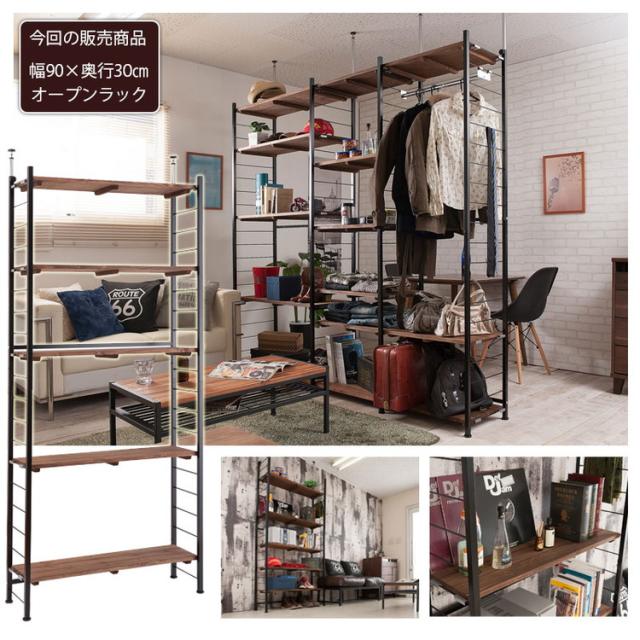 Radi オープンラック 幅90 奥行30 ブラウン ブラック オープンラック ワードローブ ヴィンテージ 壁面ラック 棚 つっぱり 薄型 収納棚 ディスプレイラック 店舗什器 カフェ(代引不可)【送料無料】