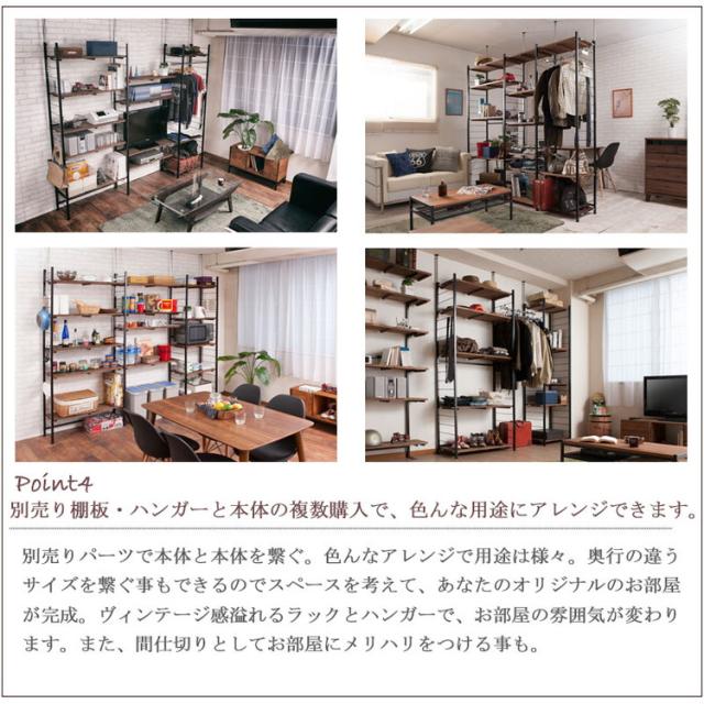 棚板を10cm間隔で好みの位置に自由にセットできる楽しい家具。ディスプレイ空間とハンガーラックで見せるワードローブなどオシャレな店舗風にお部屋をイメージ。