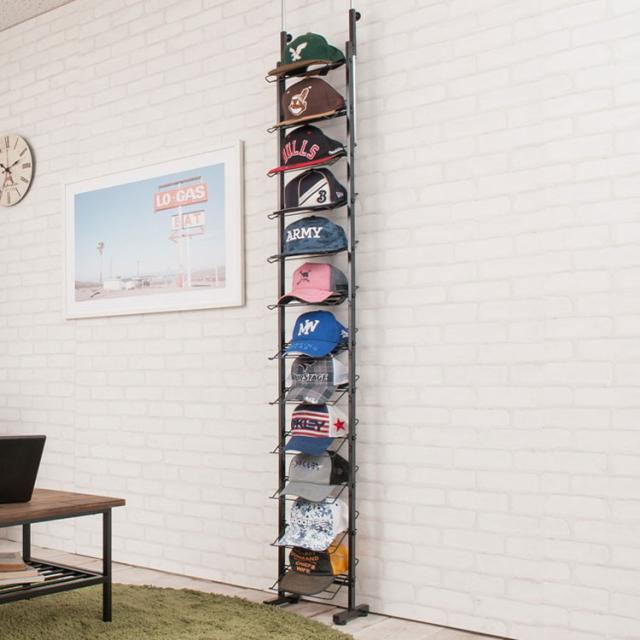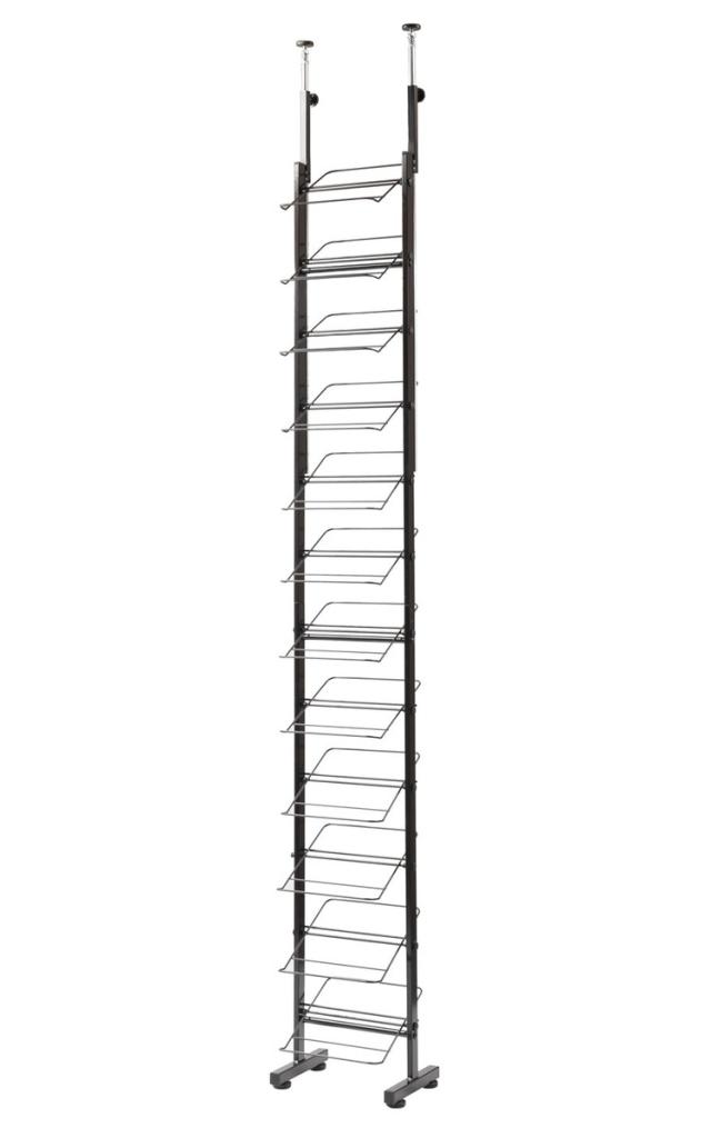 スチールの強さを打ち出すソリッド感が魅力のブラックカラー。薄型設計で突っ張り式の機能的シューズラック。