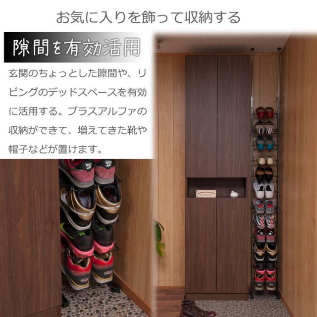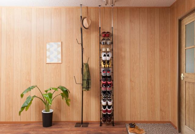 低めの玄関框をまたいだ状態でも設置できるように微調整可能なアジャスターがついており、突っ張り式で安心。3サイズ展開で収納量に応じて選べます。