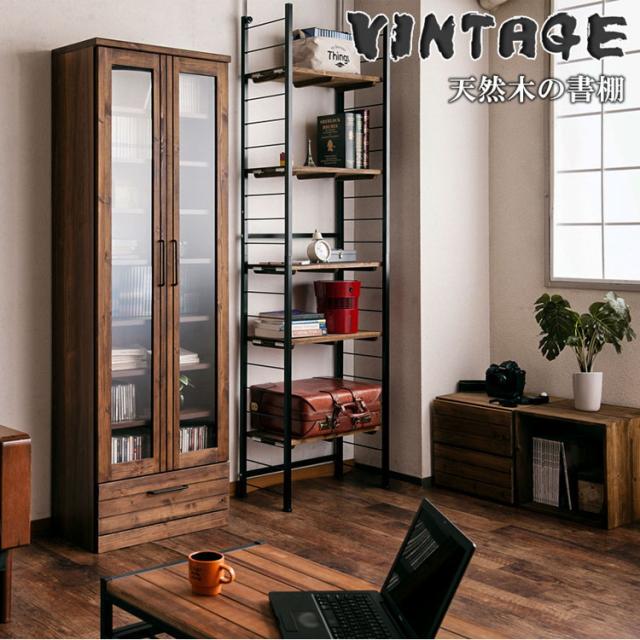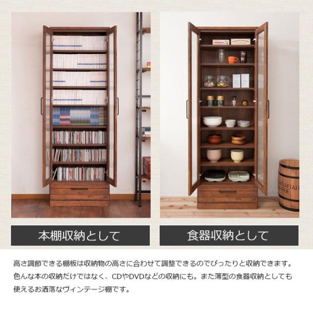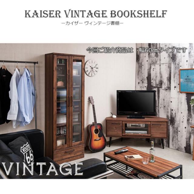 Kaiser 天然木書棚 幅60 ハイタイプ ブラウン 本棚 コミックラック おしゃれ オシャレ 扉付き ガラス扉 食器棚 カップボード キッチンボード ブックシェルフ モダン ヴィンテージ 薄型 雑誌収納(代引不可)【送料無料】