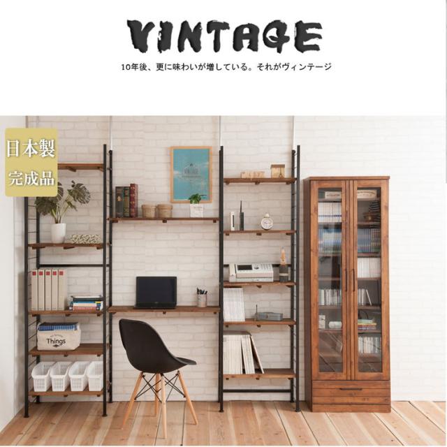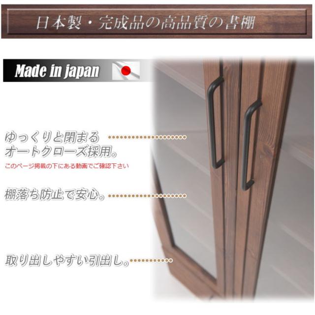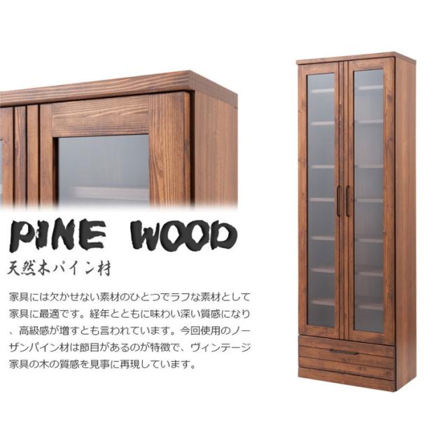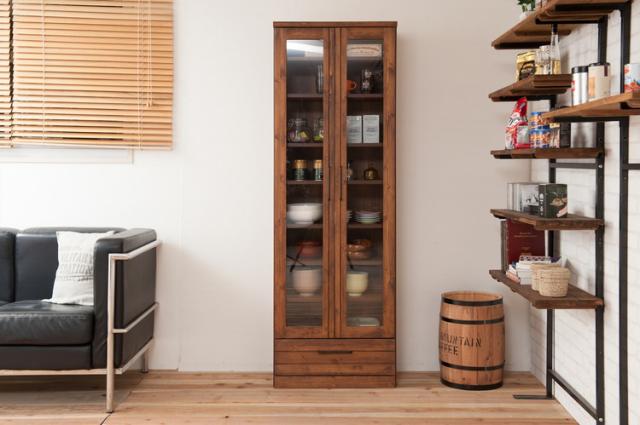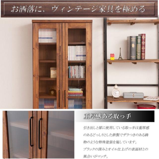 前板に雰囲気あるパイン材を使用し、味のある塗装に仕上げたボードに重厚な取っ手を取り付けた存在感あるたたずまい。ガラス扉付きで本棚はもちろん食器棚やディスプレイ棚としてもGood。