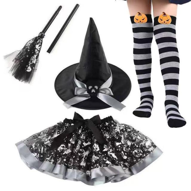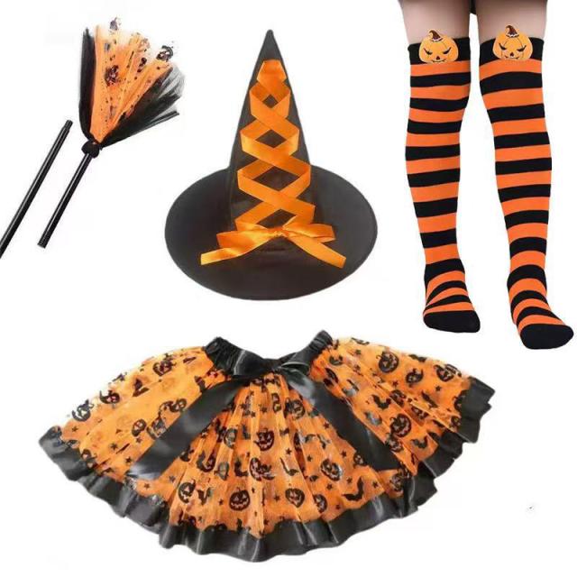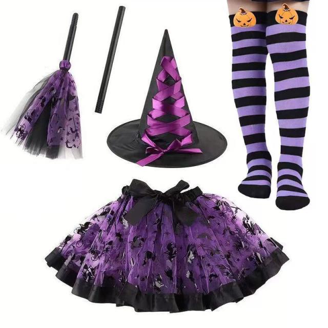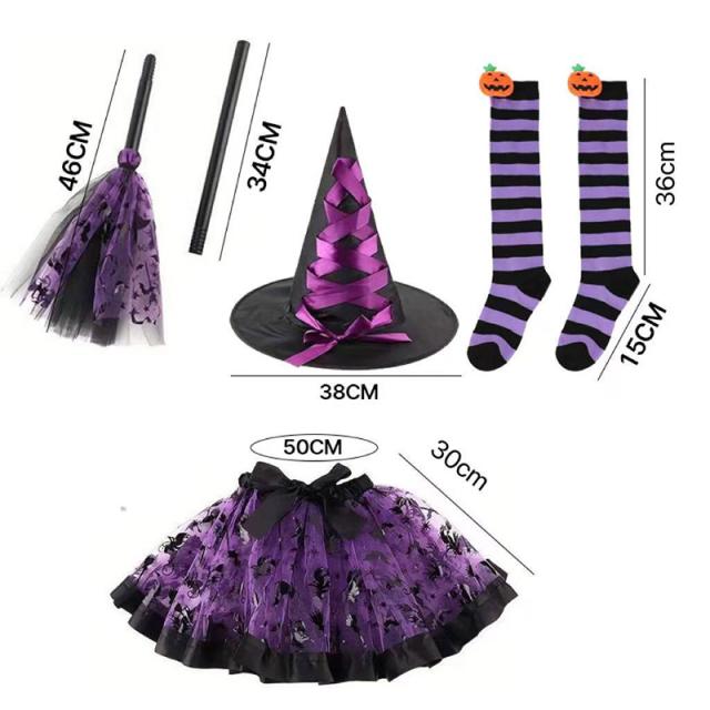 ハロウィン仮装 子供 女の子 万聖節 ワンピース 可愛い ふわふわ 魔女の帽子 ハロウィーン小物 子供用アクセサリー 4 点セット パーティー