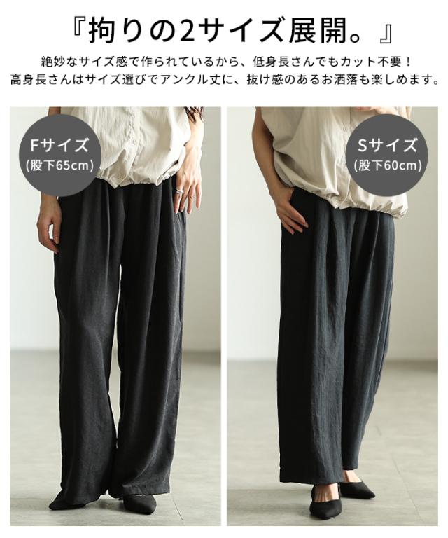 Sサイズを着用しました。着丈はかかとぎりぎりくらいです。ウエストは総ゴムで伸縮性がありちょうどいいフィット感で着用できました。股上は深く座っても楽でした。お腹周りやヒップまわりも余裕がありました。ワイドストレートパンツですっきりしたシルエットです。やわらかい滑らかな生地で肌触り良かったです。