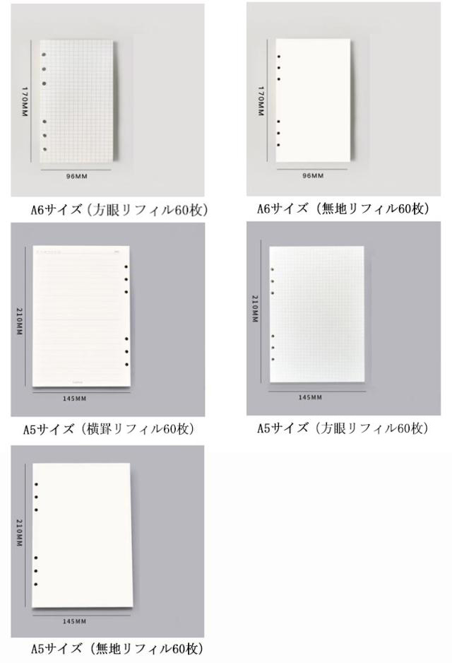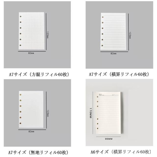 | サイズ | A7サイズ(方眼リフィル60枚) A7サイズ(横罫リフィル60枚) A7サイズ(無地リフィル60枚) A6サイズ(方眼リフィル60枚) A6サイズ(横罫リフィル60枚) A6サイズ(無地リフィル60枚) A5サイズ(方眼リフィル60枚) A5サイズ(横罫リフィル60枚) A5サイズ(無地リフィル60枚) |