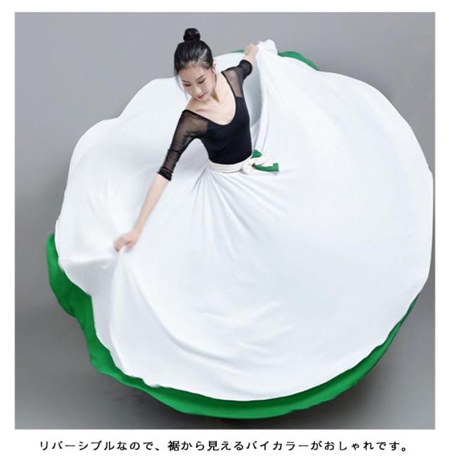 | リバーシブル 540度!一着二役の配色 2way リバーシブルスカート。 ふんわりと舞うシフォンスカート。レッスン着やダンス衣装、流行りのコンテンポラリーダンスにも! リバーシブルなので、裾から見えるバイカラーがおしゃれです。 540度タイプは、肩ほどまで裾を持ち上げられます。 ウエスト総ゴム仕様。 80/85/90/95/100cm選べる! | |