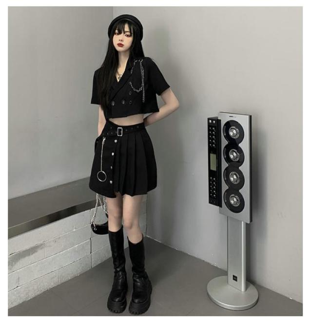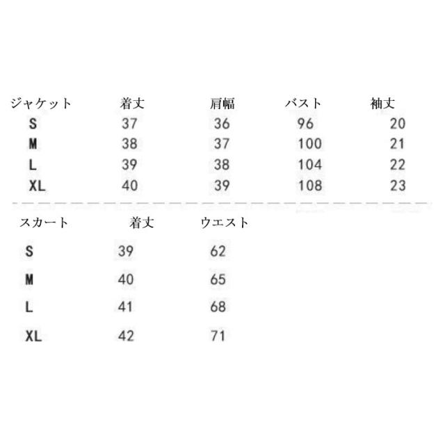 | サイズについての説明 | 5点セット内容:ジャケット+スカート+ベルトチェーン サイズ表は画像をご参照ください |
