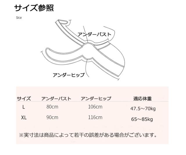 | サイズについての説明 | Lサイズ:アンダーバスト 80cm、アンダーヒップ 106cm、適応体重 47.5〜70kg XLサイズ:アンダーバスト 90cm、アンダーヒップ 116cm、適応体重 65〜85kg ※実寸法は商品によって若干の誤差がある場合がございます。 |