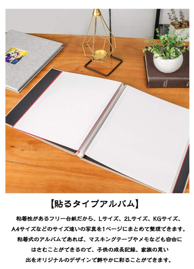 | 【粘着式アルバム】 最大360枚収納 多種類サイズの写真対応! 自由に写真を貼る! 写真のサイズが色々あるの悩み解消〜貼り付け式で自由にアレンジでき、綿麻素材でしっかりした良いアルバムでオススメ! 【貼るタイプアルバム】粘着性があるフリー台紙だから、Lサイズ、2Lサイズ、KGサイズ、A4サイズなどのサイズ違いの写真を1ページにまとめて整理できます。粘着式のアルバムであれば、マスキングテープやメモなども自由にはさむことができるので、子供の成長記録、家族の思い出をオリジナルのデザインで鮮やかに彩ることができます。 【ウィンドウありtype】アルバムのカバーにはフロントウィンドウがあり、お好みに合わせて写真を入れることができます。 【長期保存に最適】しっかりした厚手のフリー台紙を使用して、インクジェットプリンタによる写真も守り、熱・光・湿気などに強く、写真の長期保管に最適です。貼るタイプは写真のレイアウトが自由にでき、何度でも張り直せる点が魅力です。 【自由にデコレーション】写真の美しさを際立たせる透明度の高いフィルムを使用した超透明フォトアルバムです。白い台紙にカラフルなシールを合わせると元気いっぱいの印象になります。フリー台紙であれば写真を貼る位置が決まっていないので、空いたスペースにシールやイラストをプラスして写真をおしゃれに演出することが可能です。 【様々な場合に適用】アルバムの写真を通して、人生の幸せな瞬間を思い出すことができるのです。子供の成長記録、DIY写真集、卒業記念集、フォトコレクション、家族やお友達とのフォトアルバム、退職される方へのメッセージ、結婚記念日のプレゼント、ポストカードアルバムなどご利用いただけます。 【DIY可能】 1.フイルムを剥がす 2.写真を入れる 3.自由に飾り付ける 4.フィルムを閉める。軽く撫で空気を抜きます。 ※残る空気は写真を劣化にします。 | |