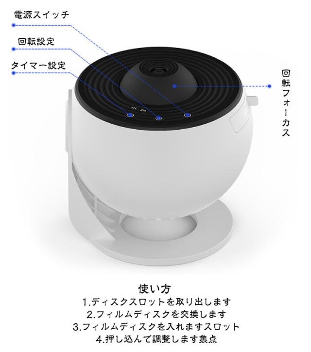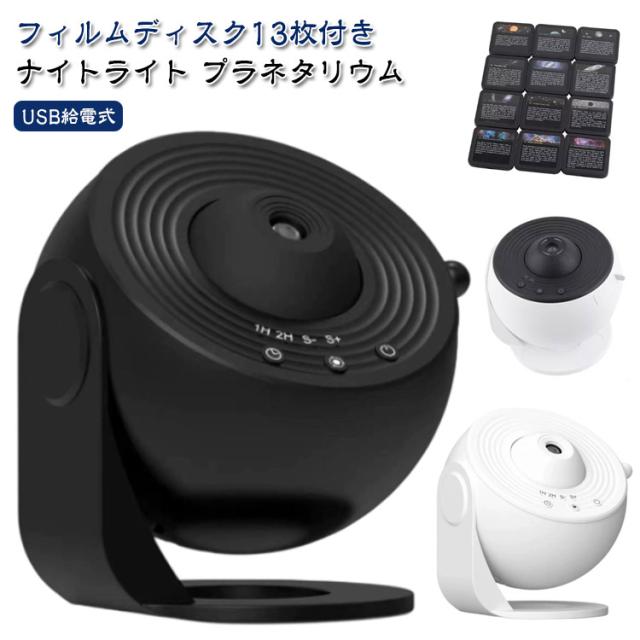 | フィルムディスク13枚付き ナイトライト プラネタリウム USB給電式 【魅惑的な投影バラエティ:13枚のフィルムディスクで宇宙、星空、天文のシーンを探索】宇宙、星空、天文のシーンをテーマにした投影ライトとともに12枚のフィルムディスクを含んでいます。太陽系、地球、月、銀河、アンドロメダ銀河、ハッブル深宇宙、北アメリカ星雲、ミスティックマウンテン、小マゼラン雲、NGC4302-NGC4298、M60UCD1などが含まれています。自宅で魅惑的かつ没入感のある体験を提供します。 【鮮明でクリアな3D投影体験:高輝度6500K光源とリアルな星空効果】高輝度の6500Kのピュアホワイト光源により、クリアで鮮やかな投影が可能です。フィルムディスクには約60,000個の星が組み込まれており、リアルな3D投影を楽しむことができます。まるでプロのプラネタリウムにいるかのような魅力的な体験ができます。 使いやすいギャラクシープロジェクター タイマー機能 プロジェクターにはタイマー設定があり、時間を選択できます。 1 時間、2 時間タイマー機能を使用して投影時間を制御できます。 調整可能な速度 投影の回転速度を好みに合わせてカスタマイズします。 フォーカス調整可 投影フォーカス調整により、最適な鮮明さと鮮明さを実現します。 投影角度 調整可 シングルアーム強化回転スタンドにより、さまざまな角度から映像を投影できます。 使い方 1.ディスクスロットを取り出します 2.フィルムディスクを交換します 3.フィルムディスクを入れますスロット 4.押し込んで調整します焦点 | |