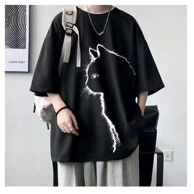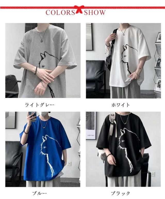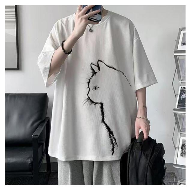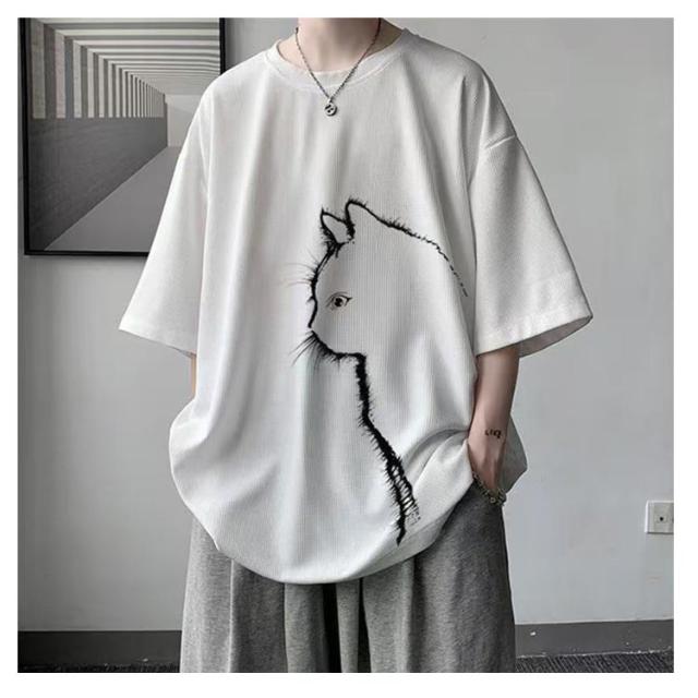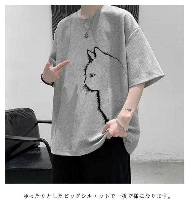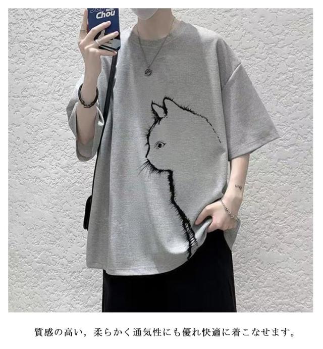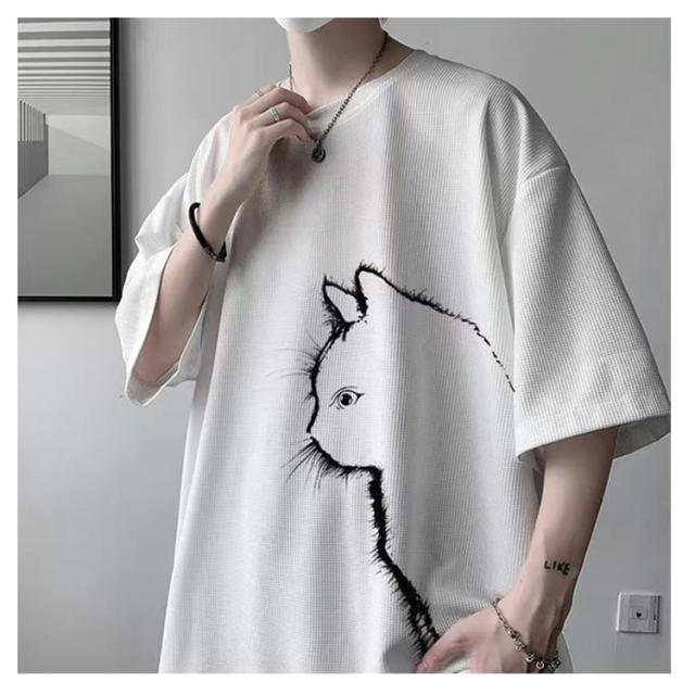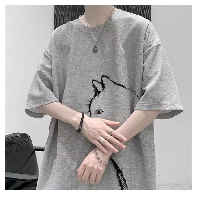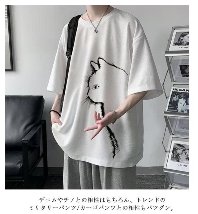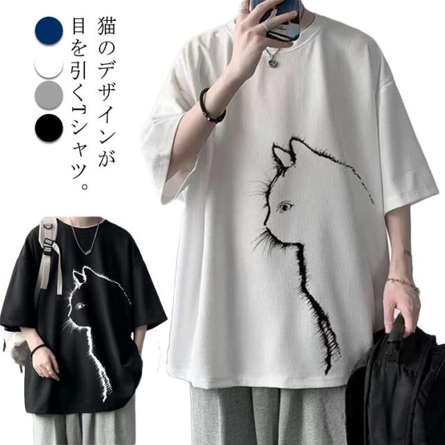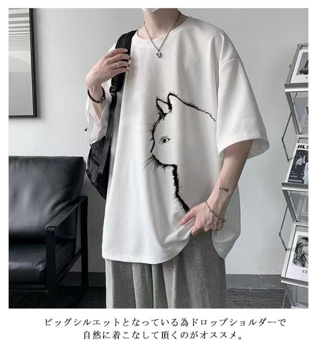 猫 カジュアル 涼しい 無地 おしゃれ Tシャツ ワッフル クルーネック 半袖 ゆったり トップス 大きいサイズ オーバーサイズ 猫柄 ひんやり メンズ 可愛い カットソー ビッグTシャツ 春 tシャツ 猫 シンプル 夏服 男女兼用