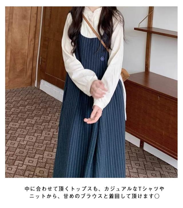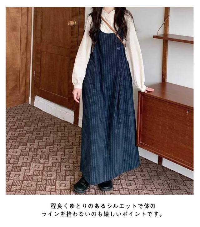 ストライプ柄 サロペットスカート ジャンスカ ボタンデザイン ジャンパースカート 体型カバー サロペット スカート ワンピース ロング ゆったり キャミソールワンピース 春 秋冬 ロングワンピース サロペットスカート ワイド 大人 カジュアル おしゃれ ネイビー 紺