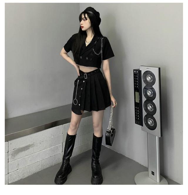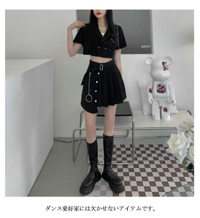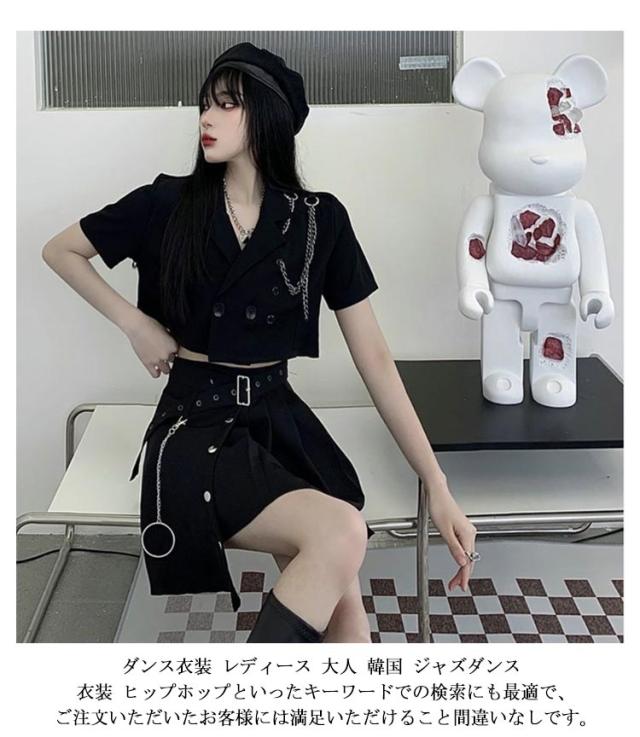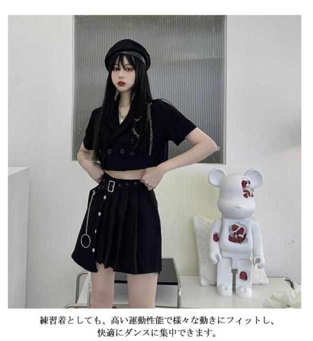 高校生 トップス 黒 韓国 セットアップ へそ出し 半袖 大人 黒 スカート k-pop 衣装 レディース ヒップホップ ジャケット アイドル衣装 高校生 女の子 大人向け 上下3点セット ダンスウェア JAZZ 演出服 練習着 ステージ衣装 オシャレ 派手