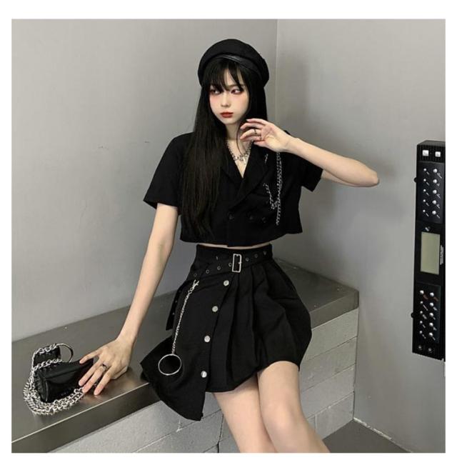 | サイズについての説明 | 5点セット内容:ジャケット+スカート+ベルトチェーン サイズ表は画像をご参照ください |