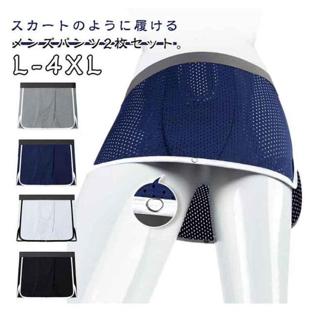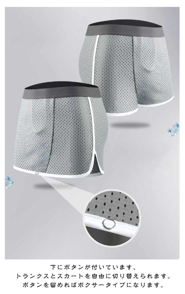 | 履くだけ簡単!スカートのように履けるメンズパンツ2枚セット。 下にボタンが付いています、トランクスとスカートを自由に切り替えられます。ボタンを留めればボクサータイプになります。 通気性よく蒸れにくいデザインです。 フロント部分にU型の穴を装備していて、大事な部分をしっかり分離することができます。 冷感生地で夏場の熱と湿気を放出して、快適に涼しくて夏を過ごします。 メッシュ生地で通気性が抜群でムレにくく、肌触りも上々! サイドのスリットのおかげで動きやすく、ストレスフリー、穿いていることすら忘れるほど。 インナーの締め付けが苦手な方に特にオススメのトランクスタイプ下着。 | |