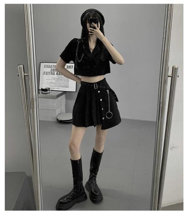 衣装 アイドル衣装 セットアップ ジャケット 半袖 黒 黒 へそ出し 高校生 ジャズダンス k-pop 高校生 トップス ヒップホップ スカート 韓国 大人 女の子 大人向け 上下3点セット ダンスウェア JAZZ 演出服 練習着 ステージ衣装 オシャレ 派手